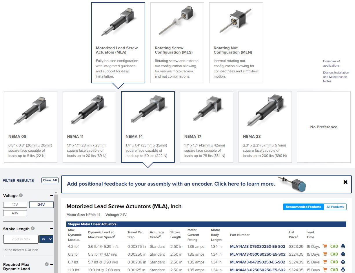 The new Thomson online tool for stepper motor linear actuators streamlines the search, selection and overall purchasing experience.