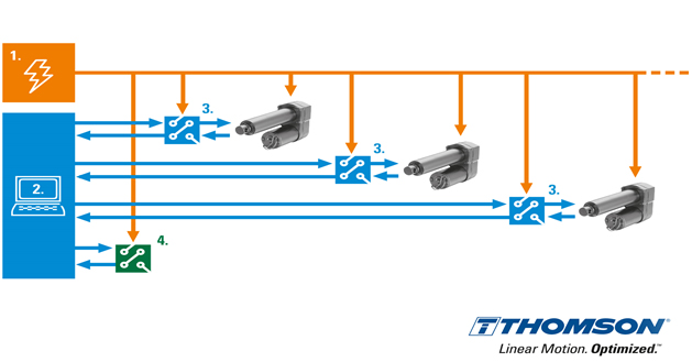 • Low-level power switching. Traditional actuators often rely on large, power-inefficient relays or independent controllers to extend, retract or stop the actuators. By using onboard electronics to manage the power, current at the switches or contacts is reduced from 20 A to less than 22 mA, enabling a simpler and less expensive system design.
