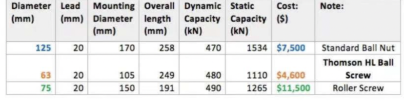 標(biāo)準(zhǔn)配置的滾珠絲杠可以解決這個問題,但是它的直徑是高負(fù)載滾珠絲杠的兩倍,而且價格同比高出63%。滾柱絲桿也有該負(fù)載能力,但相對于高負(fù)載滾珠絲杠,螺母尺寸大50%,價格高出150%。